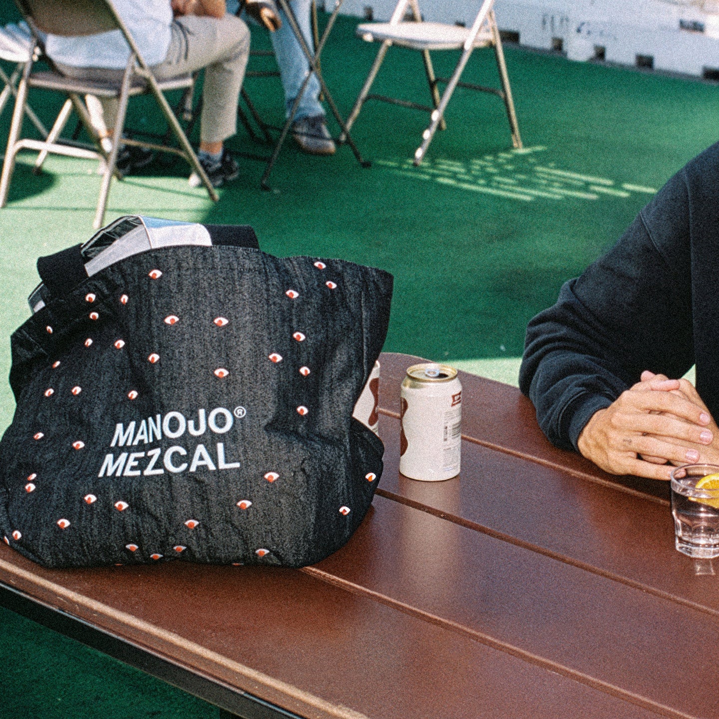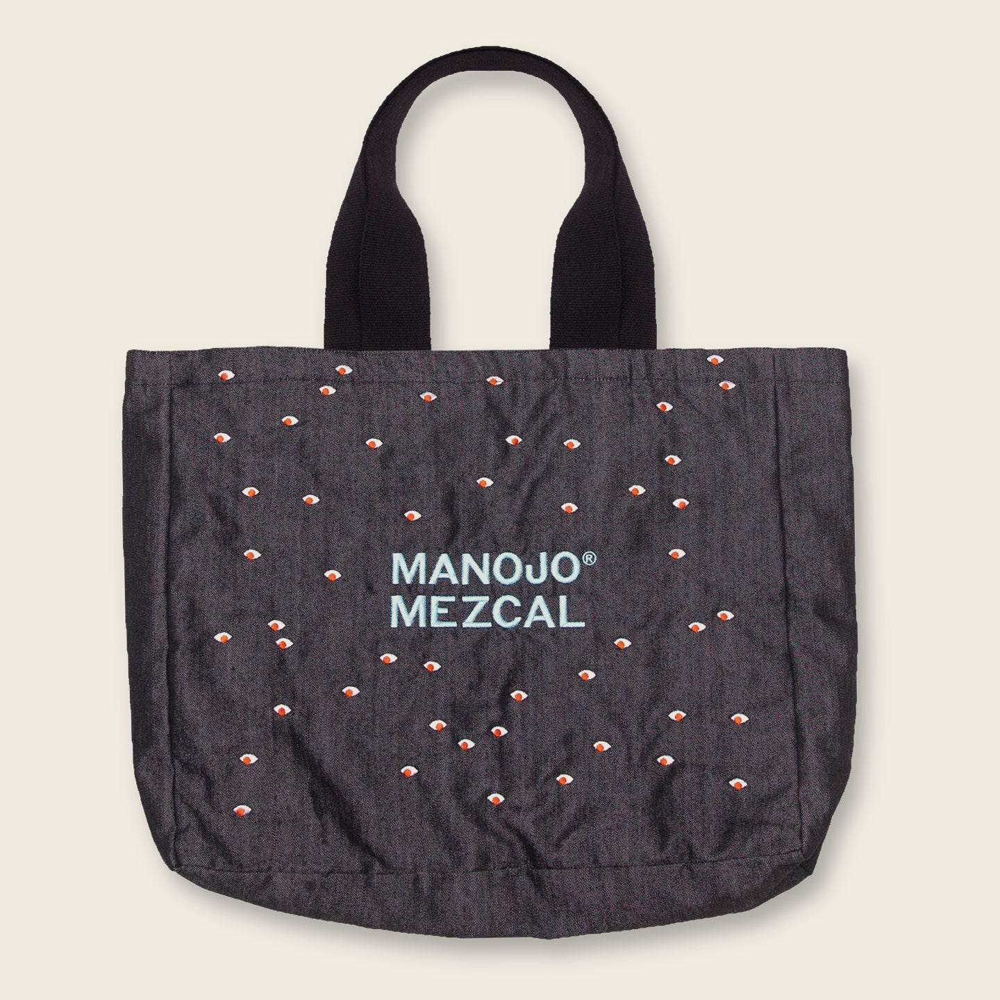 Black denim embroidered tote back with internal bottle sleeve and zipper wallet pocket.